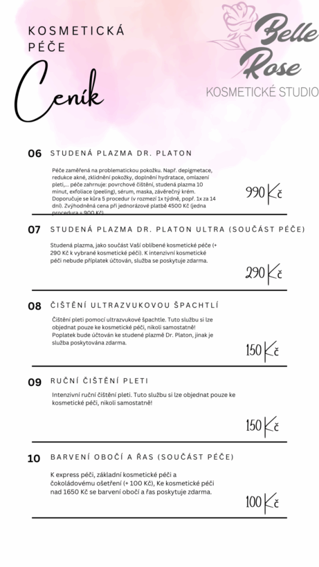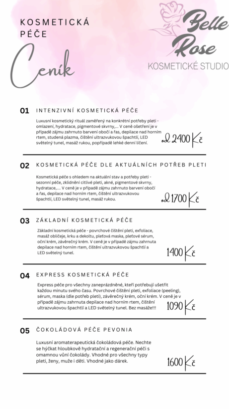 V kosmetickém studiu Belle Rose se můžete těšit na individuální přístup a služby, díky kterým se Vaše pleť bude cítit jako v bavlnce.